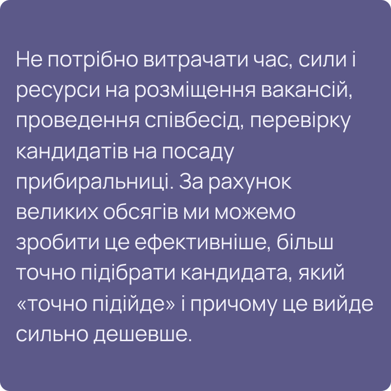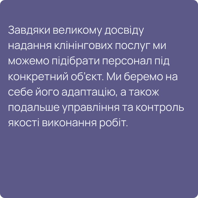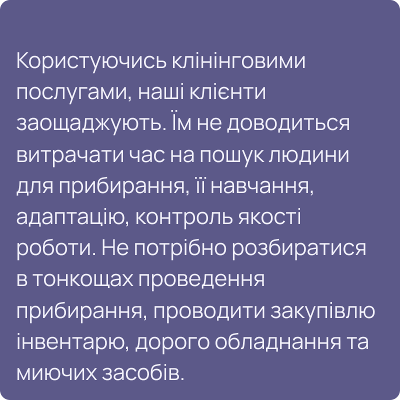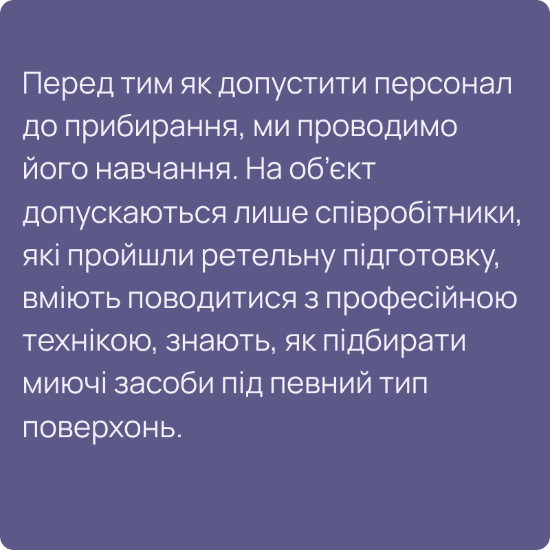 Наші співробітники – це в основному жінки віком близько 45 років. Вони пройшли перевірку службою безпеки, навчання, тому можуть впоратися з будь-якими завданнями в рамках наданих нами клінінгових послуг.