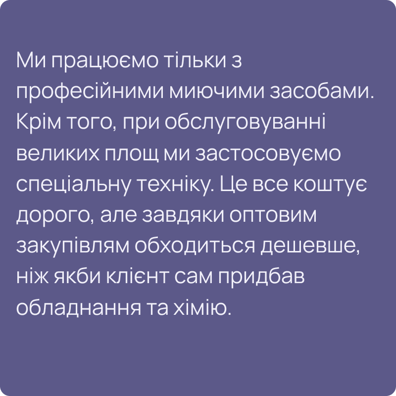 Ми можемо працювати як зі своїм інвентарем, так і з витратними матеріалами клієнта. Ми вважаємо за краще проводити прибирання своїми миючими засобами, так як наші клінери, знають, як з ними поводитися, як підбирати їх під тип поверхонь. Якщо клієнт хоче використовувати тільки свою хімію, ми просимо провести інструктаж по роботі з ним і не несемо відповідальності за результат.